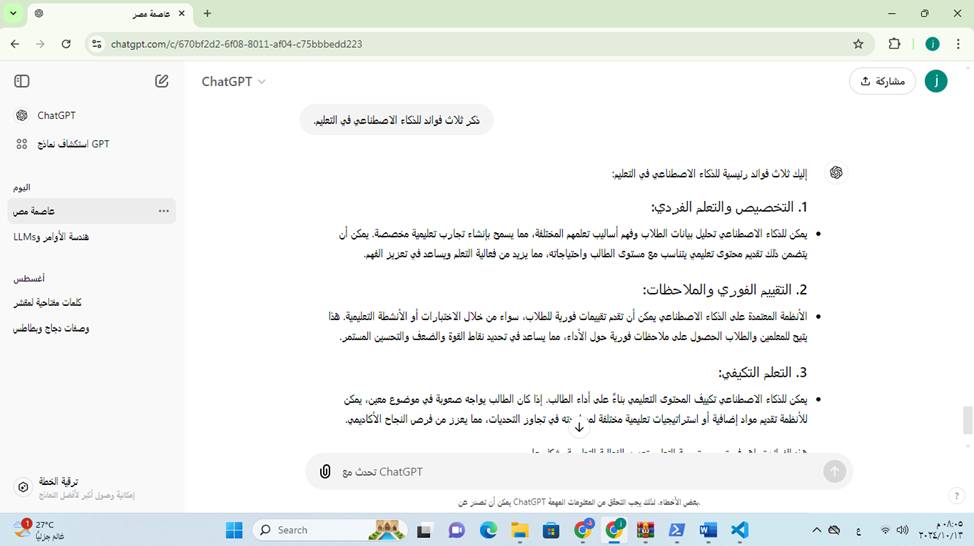 - الأمر المغلق: “اذكر ثلاث فوائد للذكاء الاصطناعي في التعليم.”